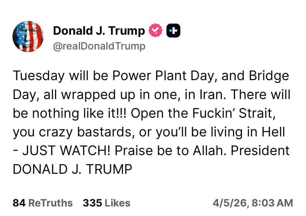 That’s unlikely. Just Wednesday night he told America that the U.S. doesn’t “need” the strait to be open. If we don’t need it open, why threaten to blow up Iranian power plants (most likely war crimes) if Iran doesn’t open it?